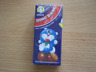 DING DANGと書いてありますが、パッケージの絵は日本の国民的アニメキャラクターに似ていますね。メーカーはマレーシアの金楽食品貿易で、ブランドのマークの「KINOS」もなんとなくポパイに似ています。中身はビスケット入りのチョコボールのようです。値段は0.9リンギで、日本円で24円くらいですね。まあ、何となくほほえましい感じがしますね。